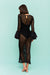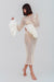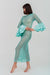 The ankle length Crochet Contrast Ruffle Sleeve Dress is a feminine piece with a fitted silhouette and long sleeves ending in tiered ruffles. Layer over a bodysuit or slip to wear this dress out for an evening look.