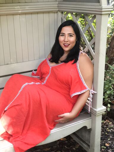 Michelle luciendo nuestro vestido otomano Pima en naranja sanguina[/caption]