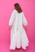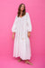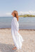 The beautiful maxi Crochet Flower Boho Dress features a semi-sheer fabric and peasant sleeves. The dress stays unique with its v-neckline and asymmetrical smocked bodice detailed with miniature crochet roses.